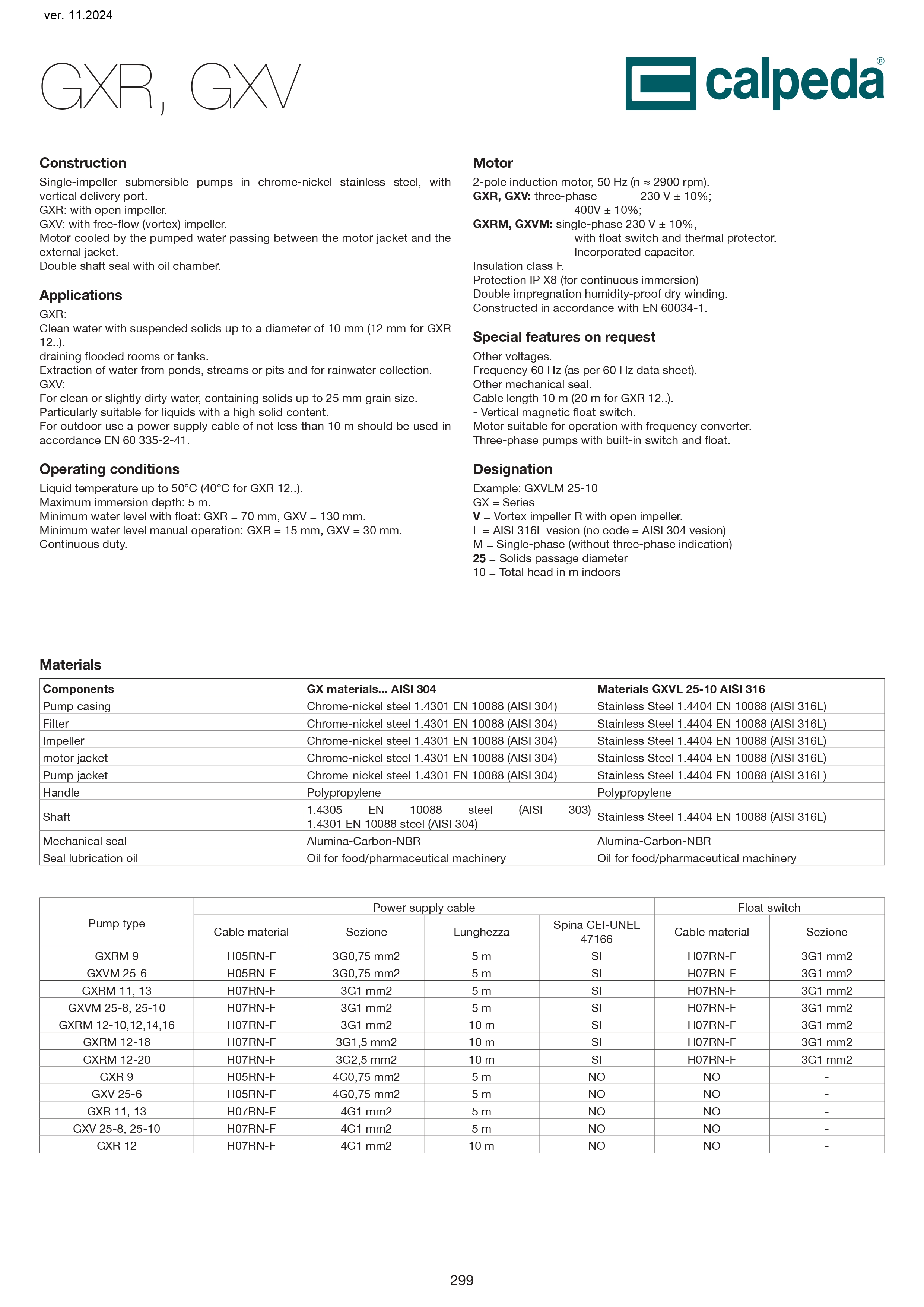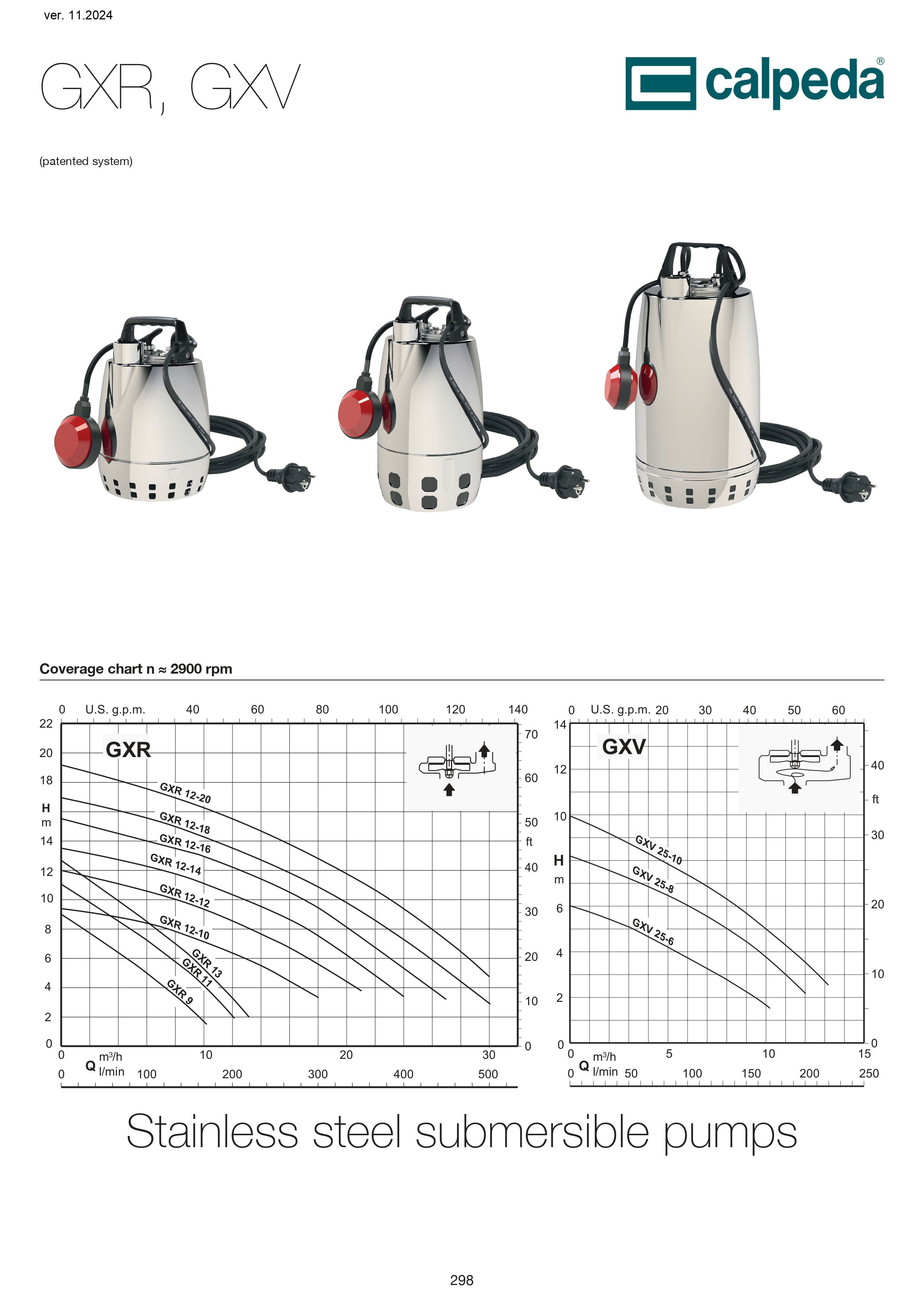 Pompe submersibile cu un singur rotor din oțel inoxidabil crom-nichel, cu orificiu de livrare vertical. GXR: cu rotor deschis. GXV: cu rotor cu curgere liberă (vortex).